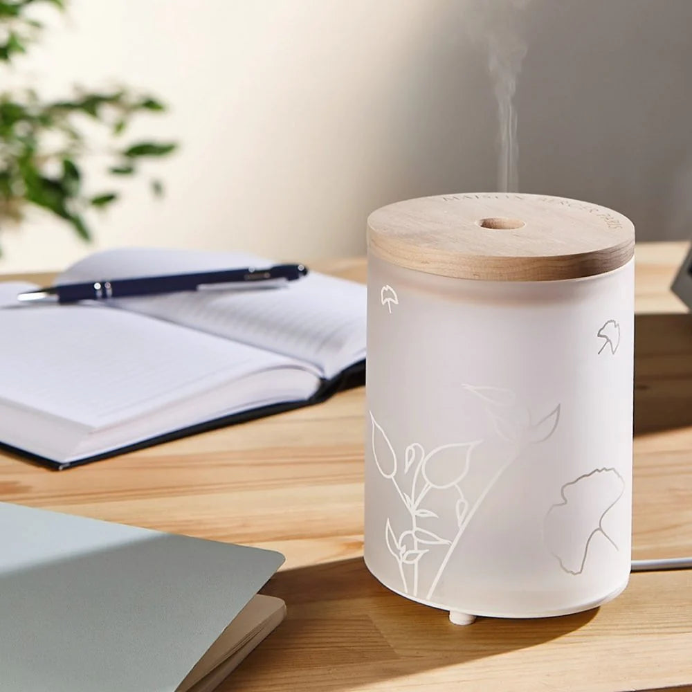 Du point de vue esthétique, ce diffuseur allie avec bonheur le verre givré et le bois, pour un ensemble synonyme de douceur. Les fleurs argentées dessinées sur la paroi participent à ce design chaleureux.